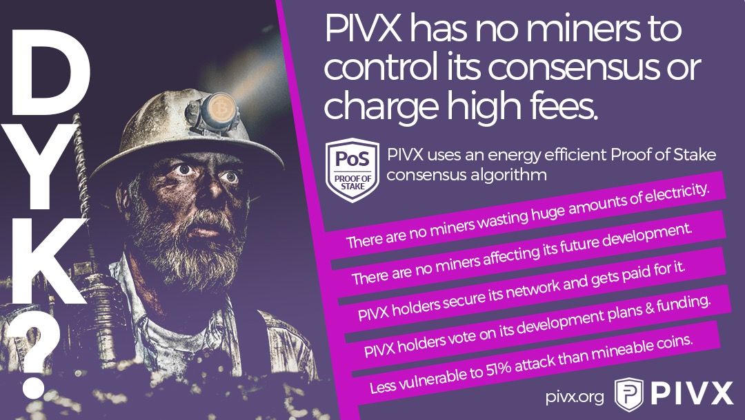 Did you also know that PIVX uses an energy efficient Proof of Stake consensus algorithm? This means that there are no miners wasting huge amounts of energy and it has a lot of other advantages as well.