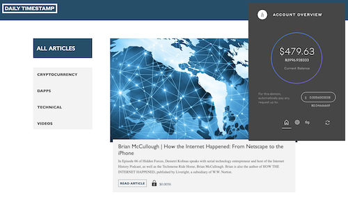 The DailyTimeStamp is one of the test sites that runs on the Hedera platform. Its main aim to testing out the use of micro-payments in content consumption online. It works well together with a chrome extension that syncs to the Hedera wallet.