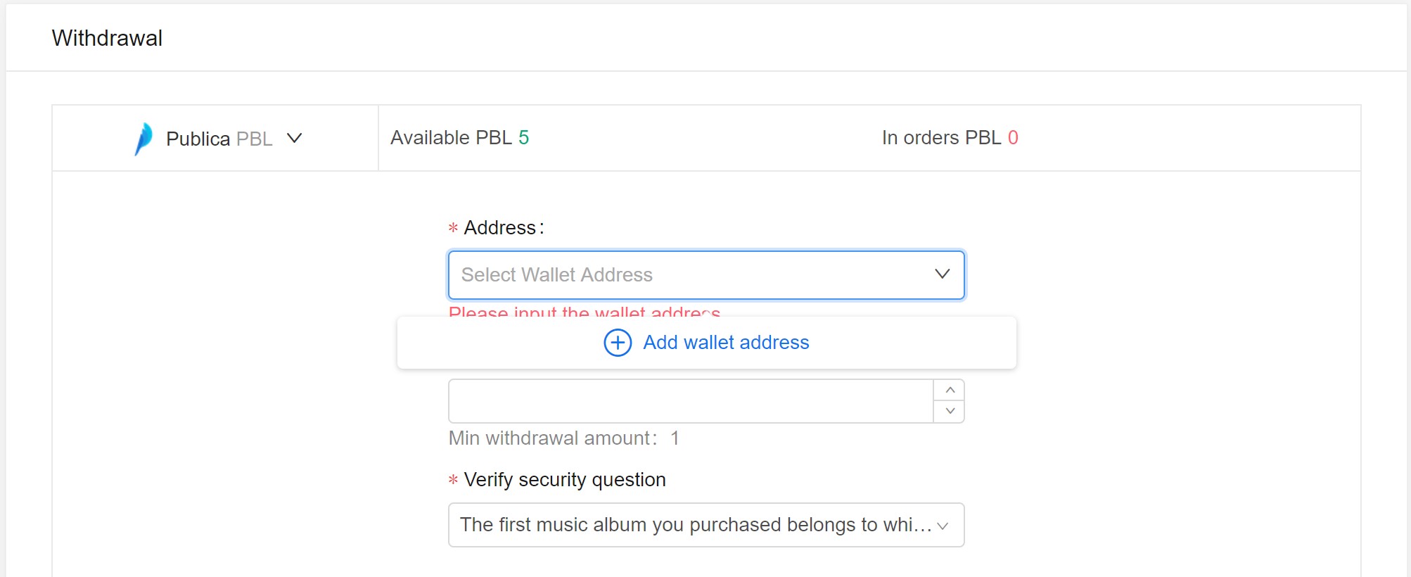 Once selected the Publica token, enter your wallet's address. Click Add Wallet Address button.