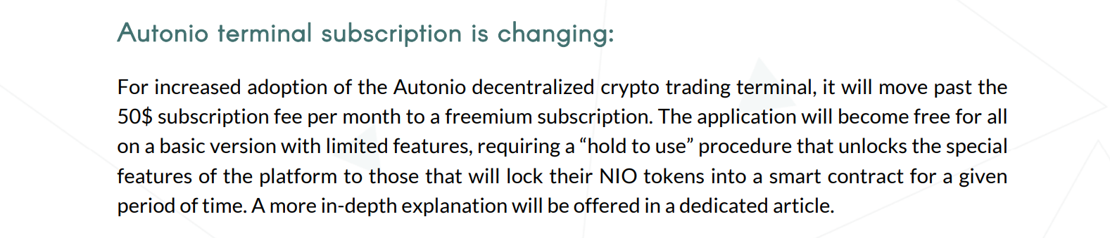 We have outlined some mechanisms that we believe will provide the Autonio community and userbase with greater utility: active staking, voting on new token listings, and fees that go directly towards liquidity on the dex. There is one final piece of news we would like to announce. Our decentralized trading terminal AutoNIO is currently undergoing a major overhaul. Once this is complete, we plan will make the base version of the app free for everyone! In order to access the rest of the AutoNIO Suite and the advanced features we are making available, a new “hold to use” model will be implemented. This will be explained in more detail in a dedicated post which we will release soon.