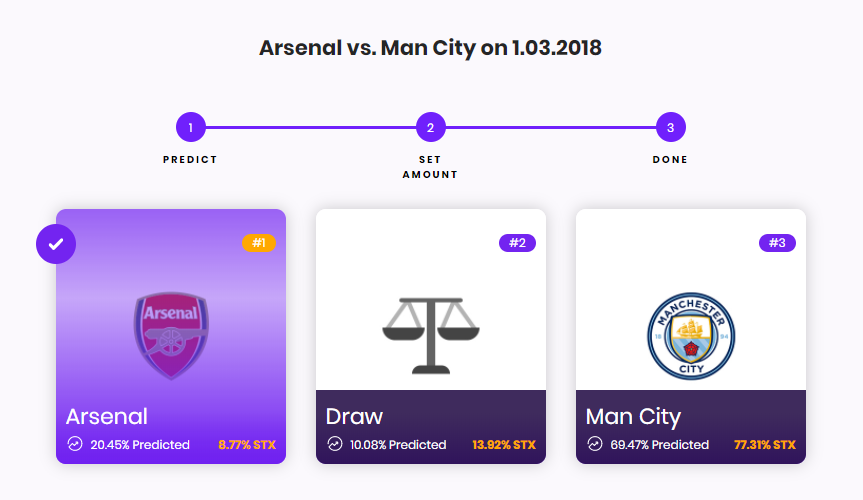 Prediction market is pretty straight forward. You simply choose the outcome of the option provided in the event and mention how much STX you want to invest. Below is an sample prediction of football league map.