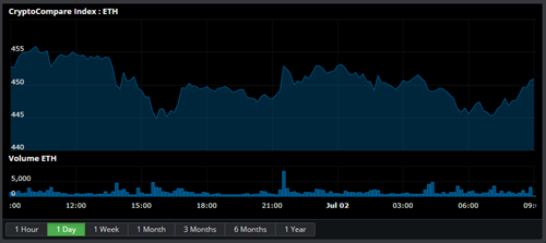 The Ethereum price has dropped 0.89% over the past 24 hours and is currently sitting at $449, with over $50 M worth of Ether exchanged in the past 24 hours on the ETH/USD pair which has a 7.8% market share of the daily trading volume.