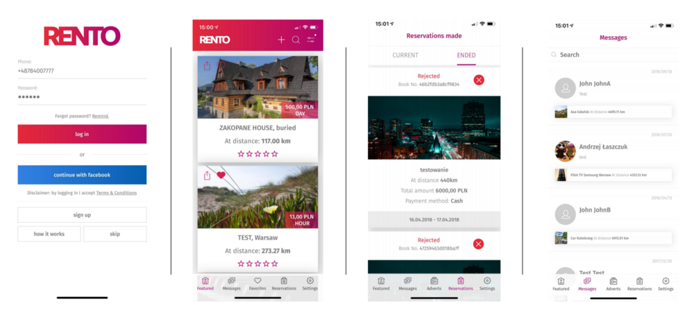 These four screens show the log in screen, having a link with social media. An overview screen with large photos and options for renting is key, with the menu buttons on the bottom, but also adding, search, and filters at the top. You can immediately check reservations that you made, and check messages, as you do have to discuss with others when you rent out.