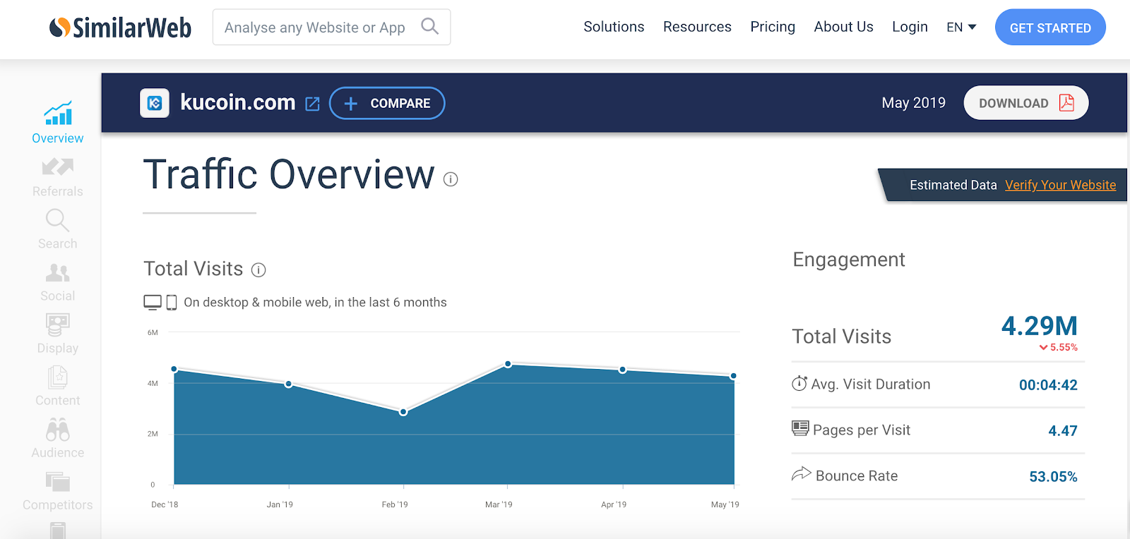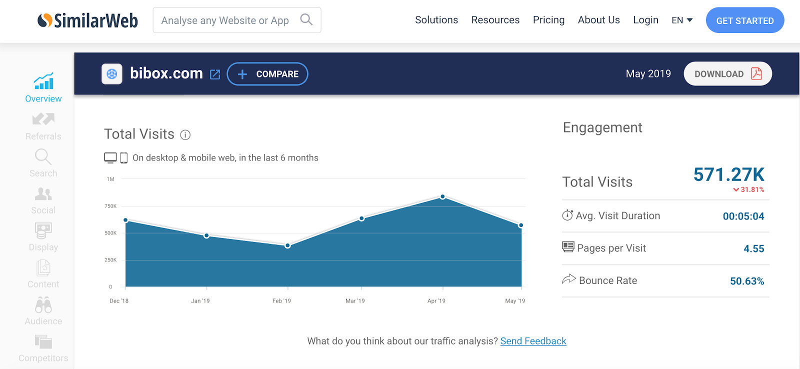 On the other hand, at the same time (June 7th 2019 at 2pm UTC) the daily trading volume for Bibox was almost 3 times that of Kucoin at around $146M. When we take a look at the monthly traffic levels this would indicate that users are trading on average of $7,667 per day! Numbers like these indicate that most of the volume is being artificially inflated by the exchange themselves in order to make Bibox seem more appealing to crypto traders and blockchain projects hoping to list on an exchange.