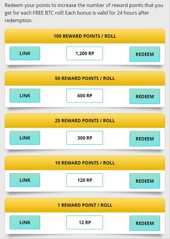 When you get 12 RPs you can redeem them to earn 1 extra RP per roll. This and all the other options are only worth it if you are able to claim more than 12 times per day, which you should be able to, I usually claim around 14-16 times per day. So the strategy is to use it as much as possible until you are able to afford the next reward which is 10 RPs/roll and continue until you reach the last one which is 100 RPs per roll and use that permanently. Now you will use the rest of your RPs to redeem ‘’free btc bonus’’ redeem the max amount possible but always keep in mind you need 1200 RPs to redeem the last RP rewards. You could also just redeem RP rewards and get to 100k to be able to transform them into BTC.