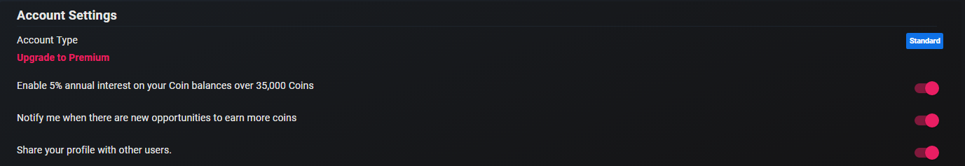 5% annual interest: Cointiply also offers a 5% annual interest, you have to enable this in Settings/Premium and you need a minimum of 35.000 coins (3.5$) to start earning the 5% annual interest which is paid weekly.
