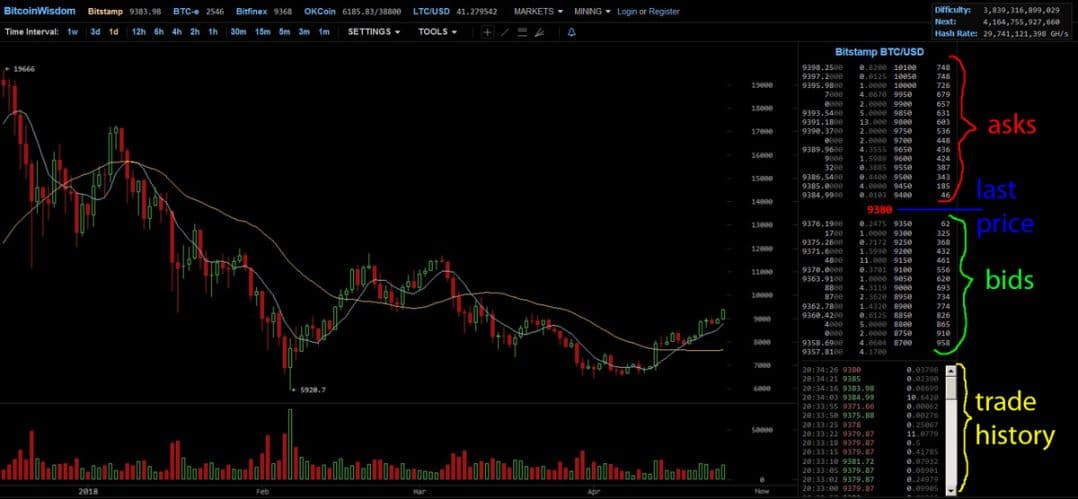 底部是交易歷史,显示交易的比特币数量和价格。最新的交易将设定最后的价格。最后一个价格反映了比特币在这个交易所上的当前估值,换句话说,就是当前的比特币价格,它只会随着进一步交易的发生而改变。