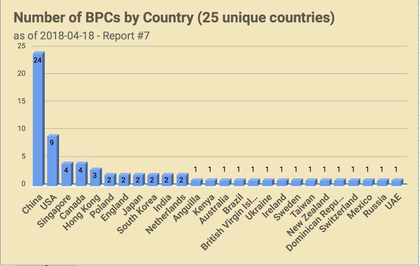 区块生产者(超级节点)候选人按国家的分布图(25个国家)