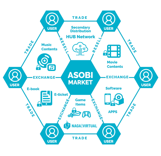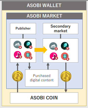 ASOBI MARKET menggunakan teknologi blockchain untuk menyediakan sistem yang terlindungi untuk mendistribusikan konten bekas.