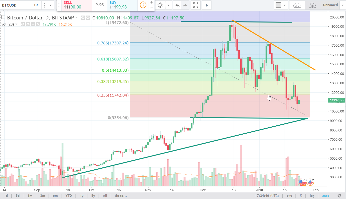 The chart just speaks for itself. Here is the one year chart that herald the rise of bitcoin from below 1000 all the way to 20000. Pay attention to the fib retracements at 10200 and 8000.