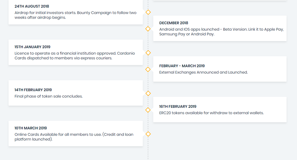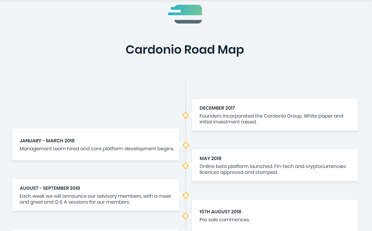 CARDONIO (CFGT) has a long way but simple and secure and flexible road map to run it ICO (Initial Coin Offering). It has started its journey just on December of 2017 with Cardonio concept formed and created white paper and just passed the couple months on 2018 with private presale. It has still to run on 2019 when Online Cards Available for all members to use. (Credit and loan platform launched).