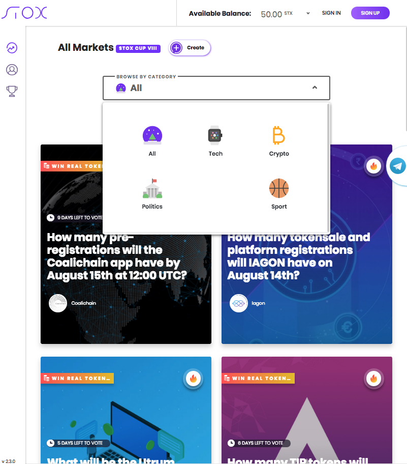 Okay yes, another fun prediction market platform. What can I say?! The layout for their prediction markets is aesthetically pleasing and follows the themes based on the prediction market.