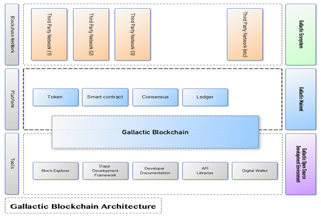 The newest iteration of blockchain architecture, GALLACTIC has been developed to attract various groups of tech enthusiasts, stakeholders and has opened new opportunities for potential business models of various kinds. As a new independent blockchain, GALLACTIC is a platform for the use of network tokens for smart contracts, consensus and ledger hosting on its ecosystem, with the GALLACTIC architecture consisting of the GALLACTIC Mainnet and the GALLACTIC open-source development platform.