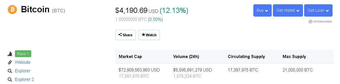 Bitcoin is at $4191.69 and has gone up by 12.13%