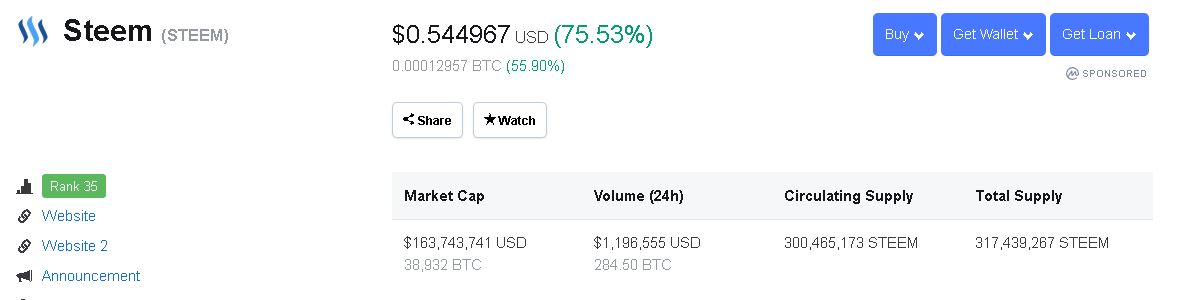 STEEM is at $.5444967 and gone up 75.53% in the last 24 hours.