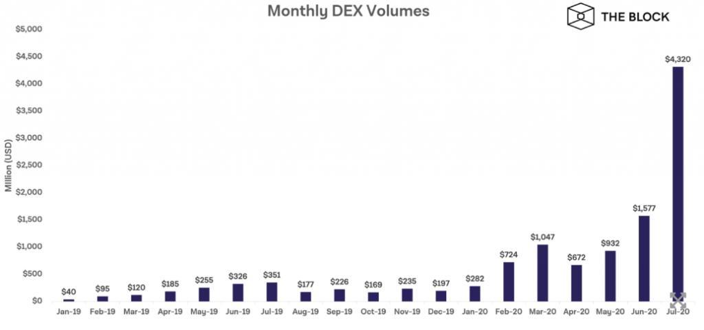 ENG. - In July, the aggregate trading volume on decentralized exchanges (DEX) amounted to more than $ 4.3 billion, significantly exceeding the indicators of previous months. There is information about The Block.