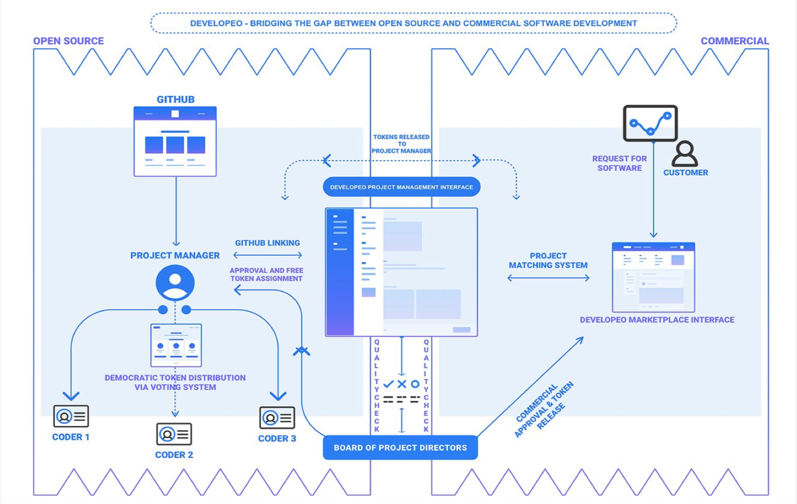 Utilizing the blockchain Developeo aims at revolutionizing the way open source development business is done. Utilizing the Ethereum blockchain, Developeo will be built to reward skilled engineers for their contributions to a software code and this will be achieved using smart contracts. The contributed code will first undergo review in the community of code contributors before rewards are distributed. Developeo is using this platform in showing appreciation to open source developers while providing motivation for future projects and successes. Rewards are distributed at the end of each month and developers are rewarded by a decentralized voting system similar to that of Reddit.