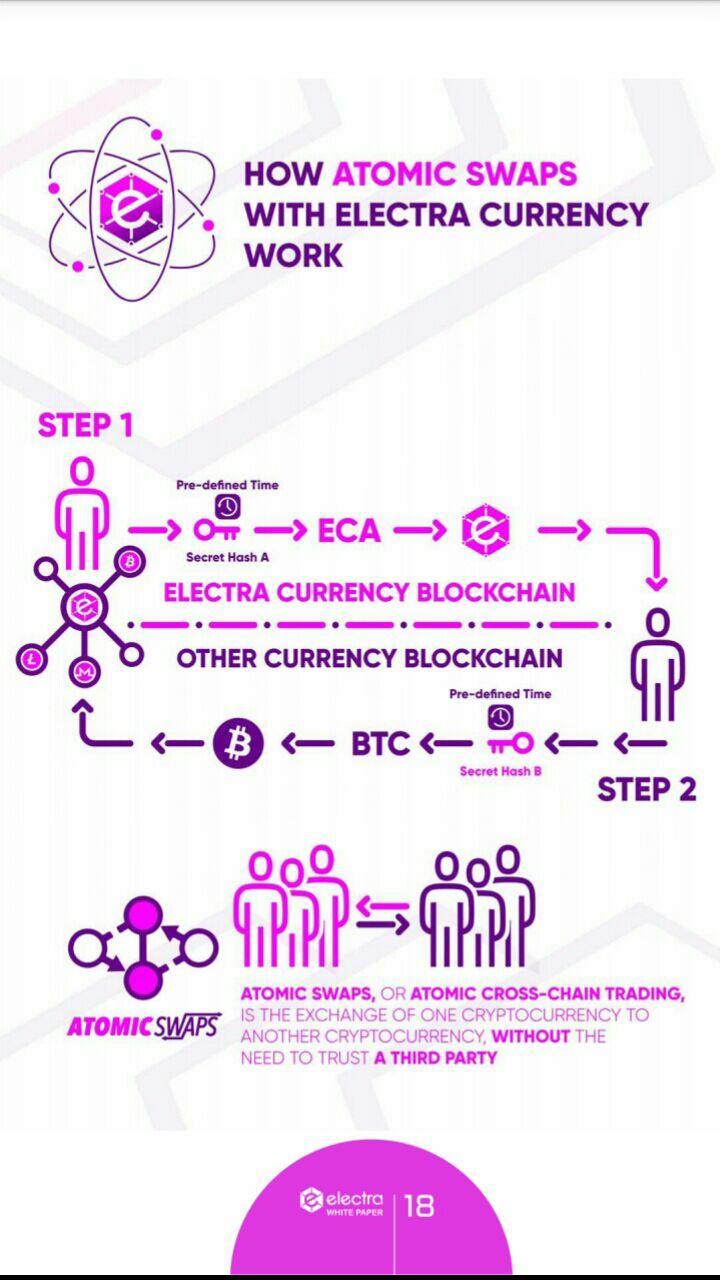 To keep it simple (you can see detailed description in the picture above) Atomic Swaps are nothing more than changing your Electra holdings (ECA/s) into any other cryptocurrency you want without a third party (exchange)! As you can imagine this will be revolutionary!