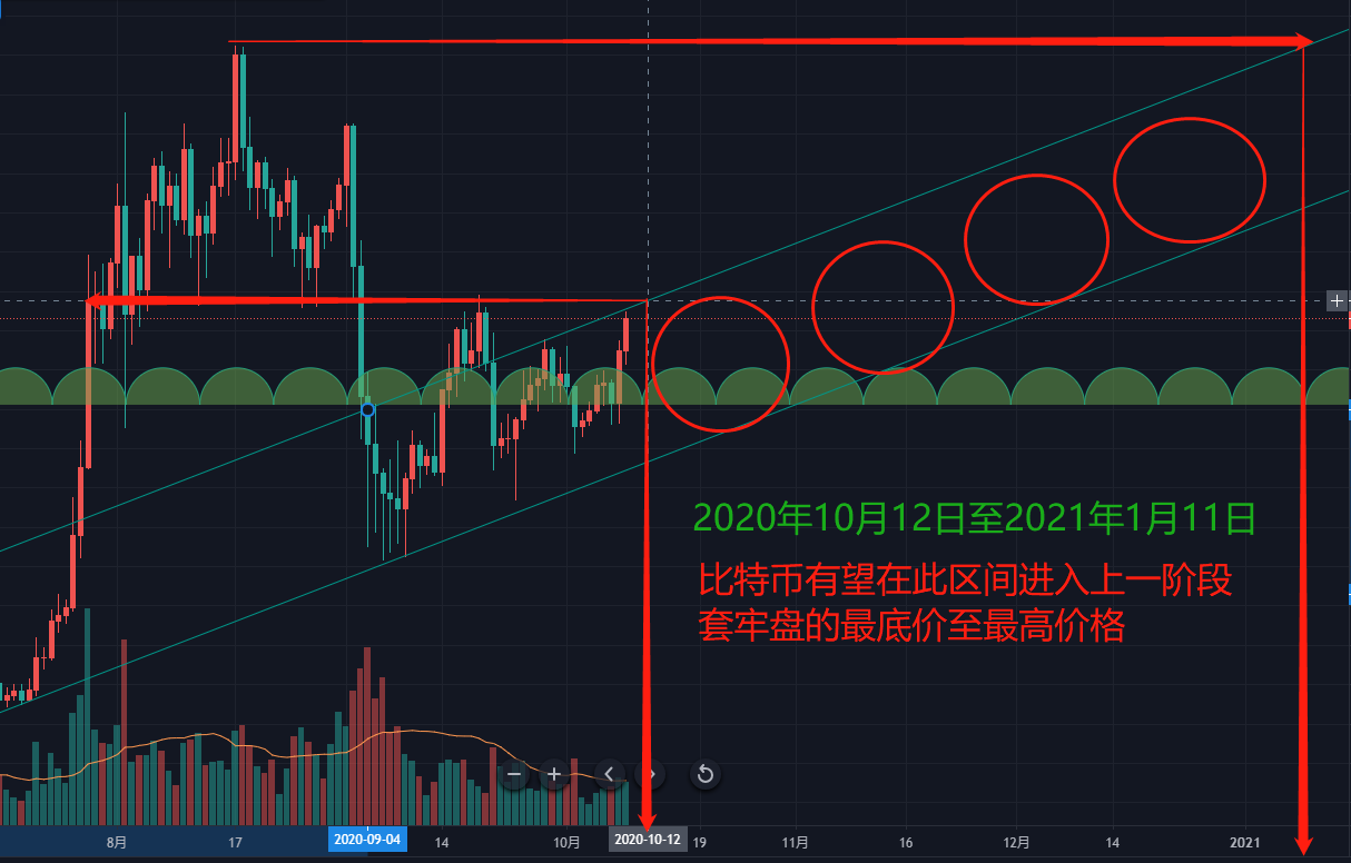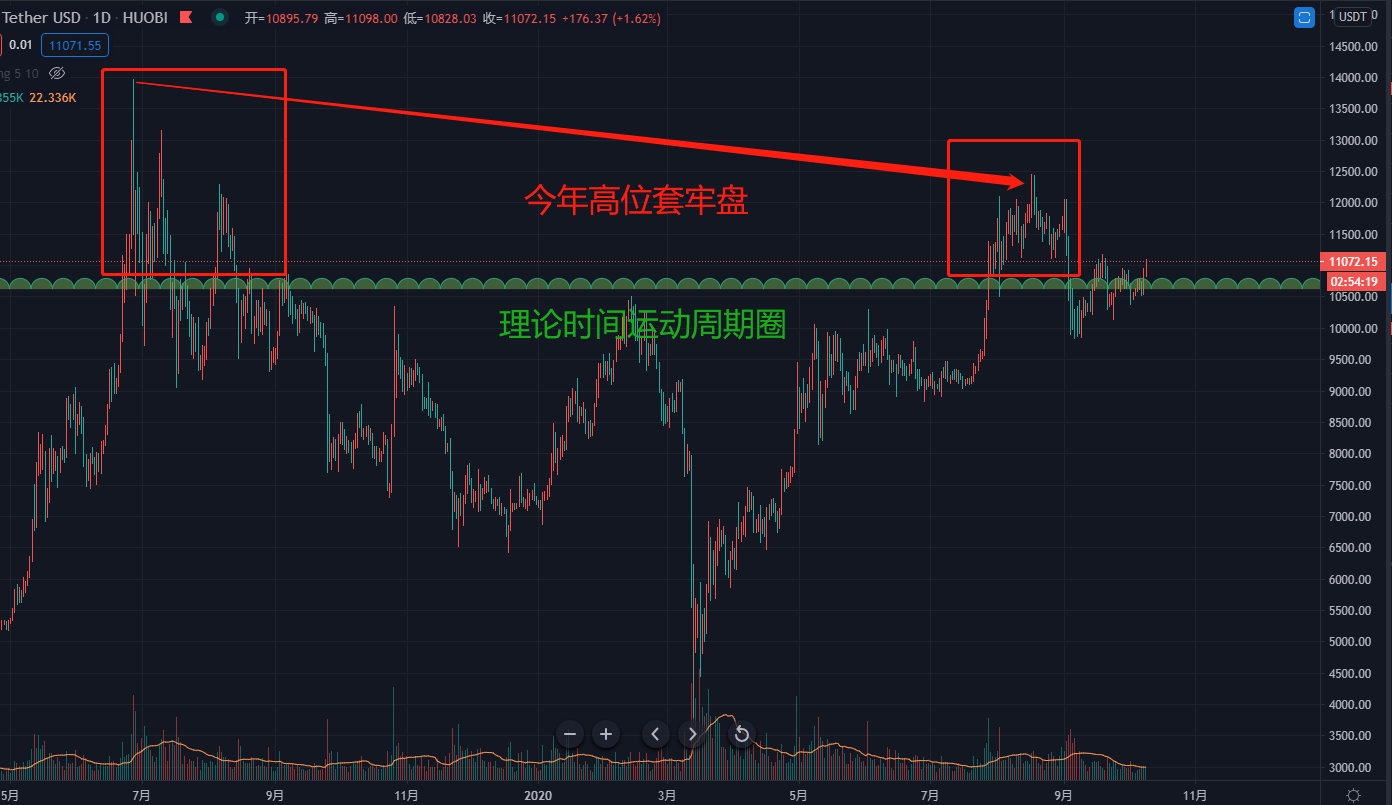 前一个套牢箱体持续了36天,上下振幅达到了18.47%,当比特币价格突破当前箱体高位11180美金后,面临的就是大量的抛压,那么,这个时间大概将在何时发生,我们从时间周期作下预估,上图: