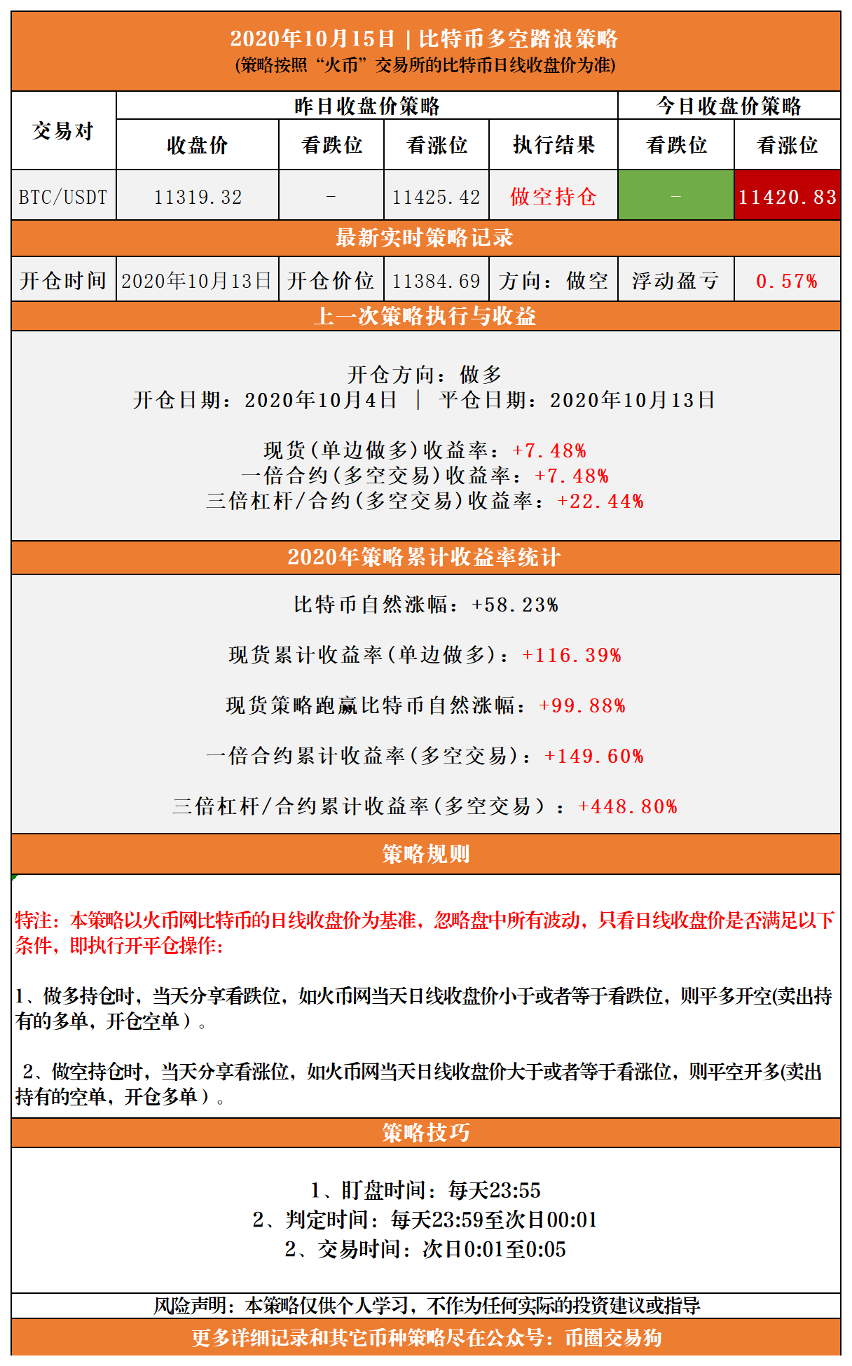 上一次平掉多头仓是10月13日,以火币网比特币收盘价11384.69平仓,拿到了做多的+7.48%收益率,同时这个价格也作为了反手开空至今的开仓价。