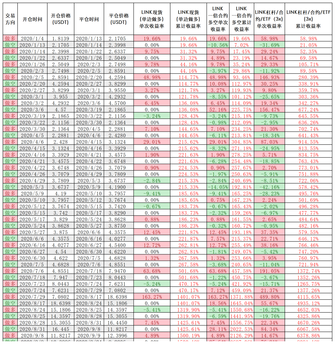 上面这张图来自踏浪策略对币种LINK的应用,图中截取了从今年初开始到9月9日做多平仓的策略记录,有现货和一倍双向合约,以及加了3倍杠杆的合约收益(2倍以上杠杆不适合重仓,本金风险放大)。