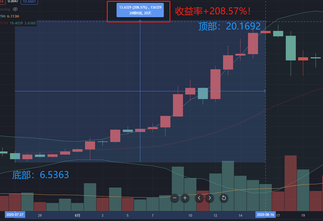 再看上图中的底部价和顶部价,底部是6.5363,但我们策略用的是第二天的收盘价开仓,高出了8.32%,另外,图中顶部是20.1692,我们策略的平仓价是第二天的收盘价18.6398,比绝对顶部价格下降了-7.58%,那么,策略拿到的收益率是+163.27%,而如果能抓到绝对顶底,收益率则是+208.57%!