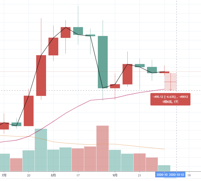 “从现有盘面分析,成交量在周线(8月31日)显著放大收跌,下影线回踩EMA(22),继而连续4周的下影线同样回补EMA(22),成交缩量,没有逐周放大。