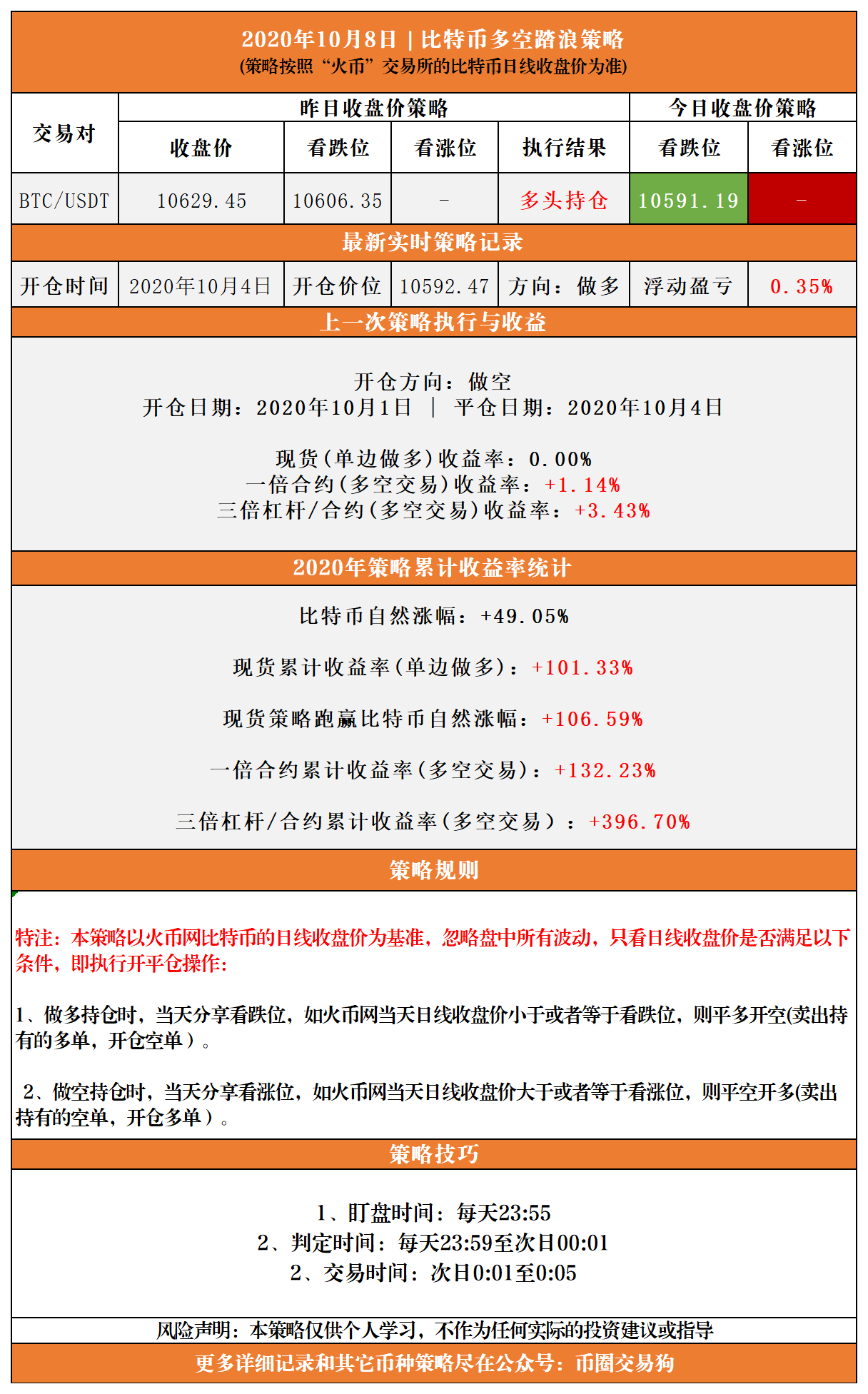 (10月8日比特币多空收盘价踏浪策略)