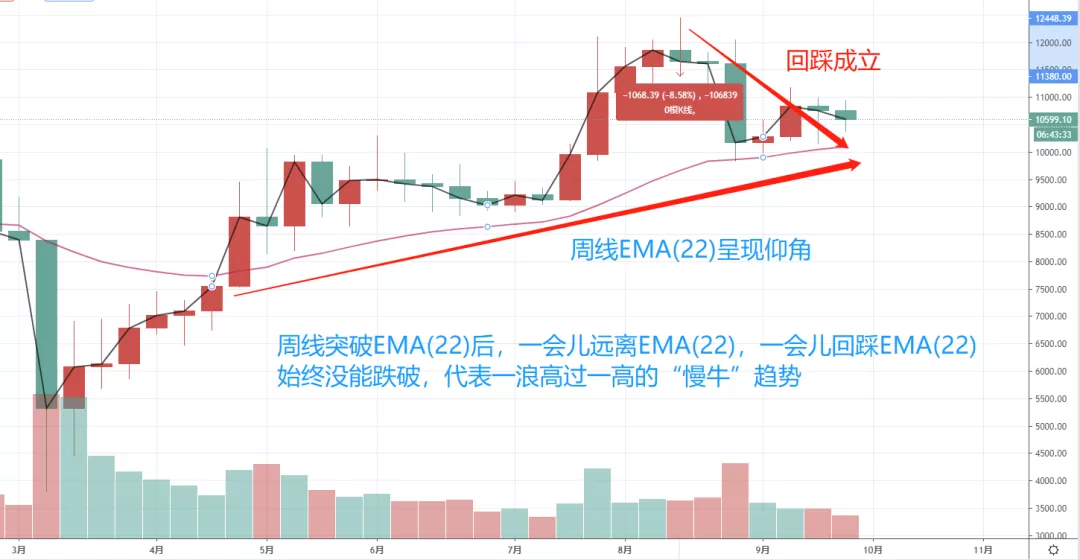 今天,比特币的走势显得异常关键,本周周线运行接近了一半时间,在上周文里有郑重指出,本周周线的收盘价如果没能跌破趋势线和EMA22,那么就可以视作回落到位,继续看涨未来几周的行情,我们回顾下这张图片: