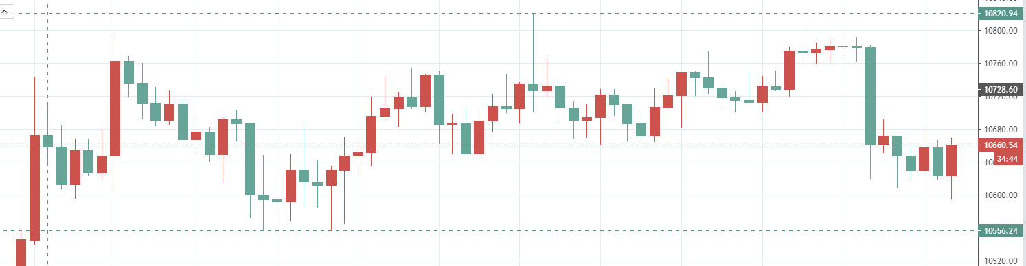 比特币从10136美金反弹至最高10820美金后,继而和10556美金的1小时回调价位形成了一个震荡区间,如图: