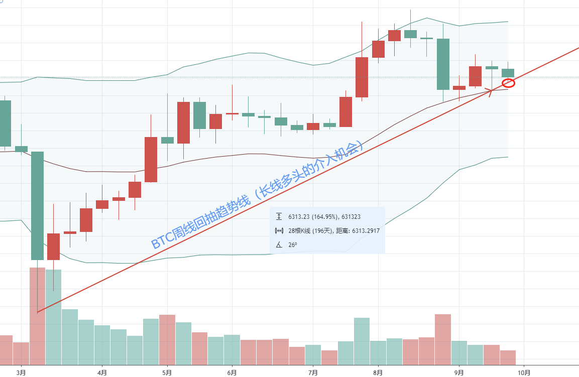如上图所示,BTC从3月份的周线最低价3800美金,一路健康上涨,触及布林上轨后由于市场多头的主导力量不足,向趋势线的价位折返而去,本周的下影线刚好抵达趋势线价位,如果没有有效跌破趋势线,那么长线玩家就应该低风险重拾仓位,对即将到来的上涨行情做好仓位的准备。