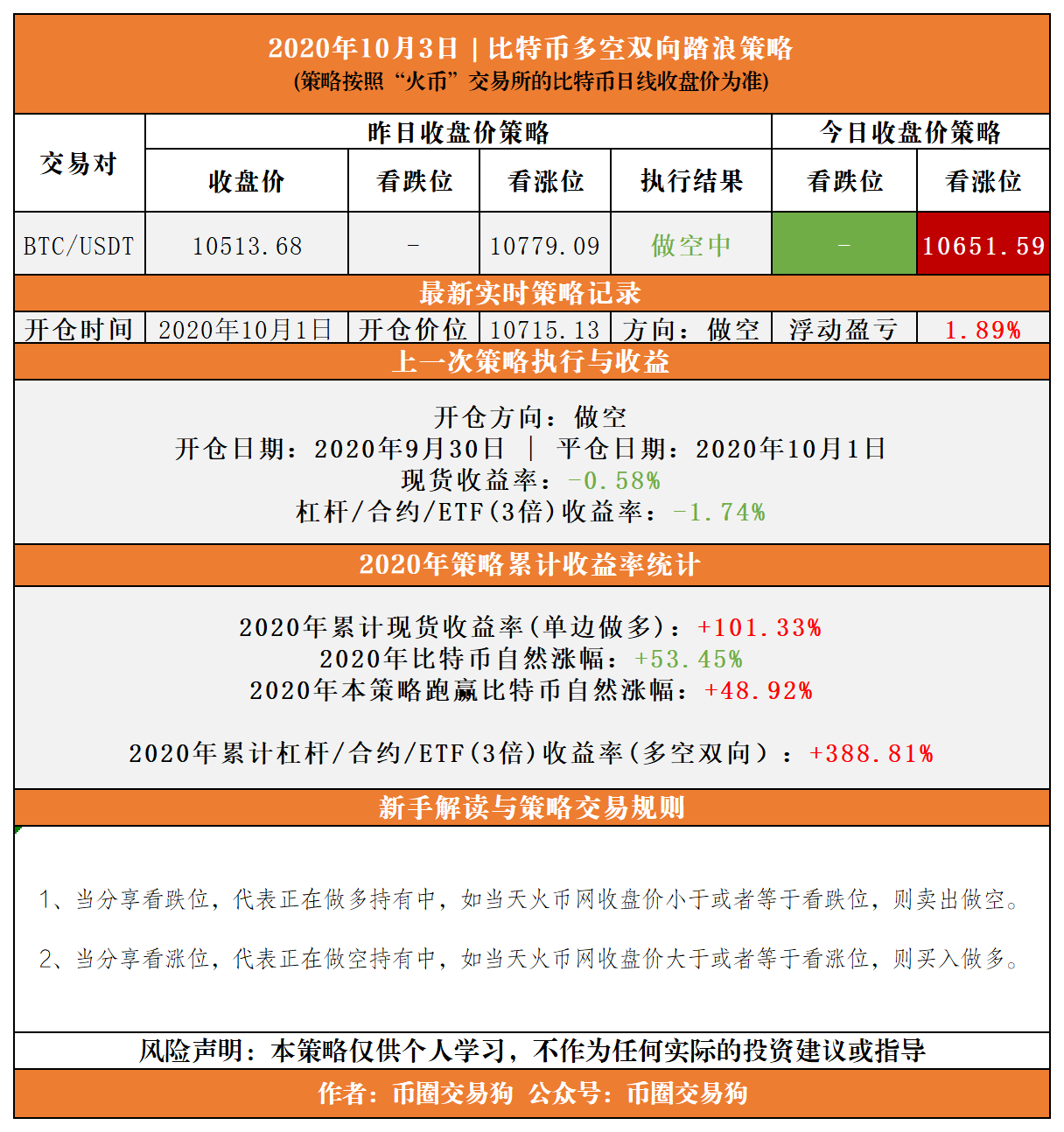 (10月3日比特币多空收盘价踏浪策略)