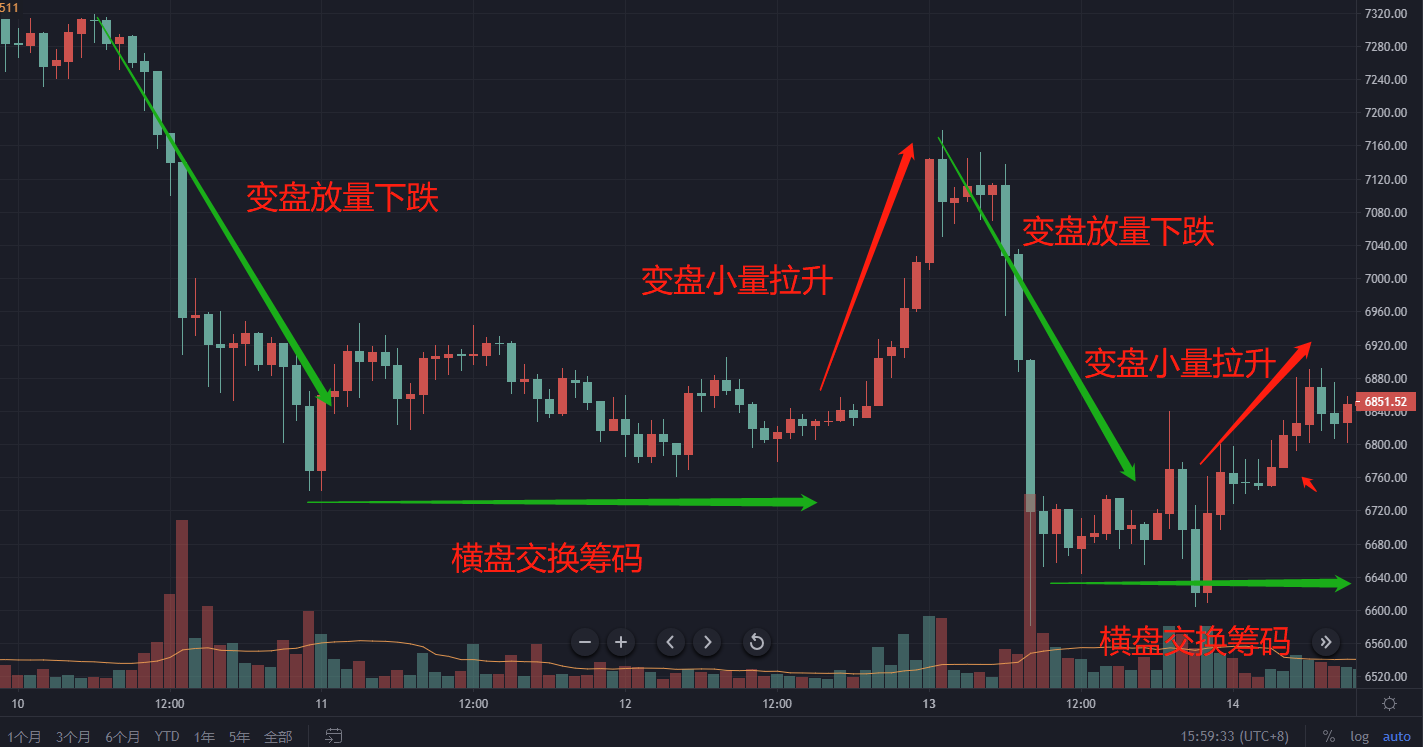 上图取自2020年4月10日(1小时线)起的放量下跌的局部走势,从图中文字和箭头可见,1小时线经历了两次放量下跌,第一次大跌后进入横盘期,筹码交换后迅速拉涨,但明显量能不足(对比前期成交量),出现第二次大跌,伴随巨大的放量动能,跌破1小时线前期低点后回暖。