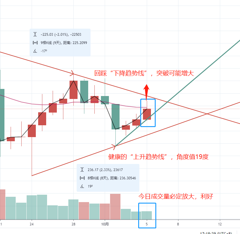 如图,上升趋势线给了我们明确的讯号:日线正在健康上升。虽然9月28日当日价格碰到下降趋势线折返,但随即回落到上升趋势线之上,形成了当下的回踩反弹形态。