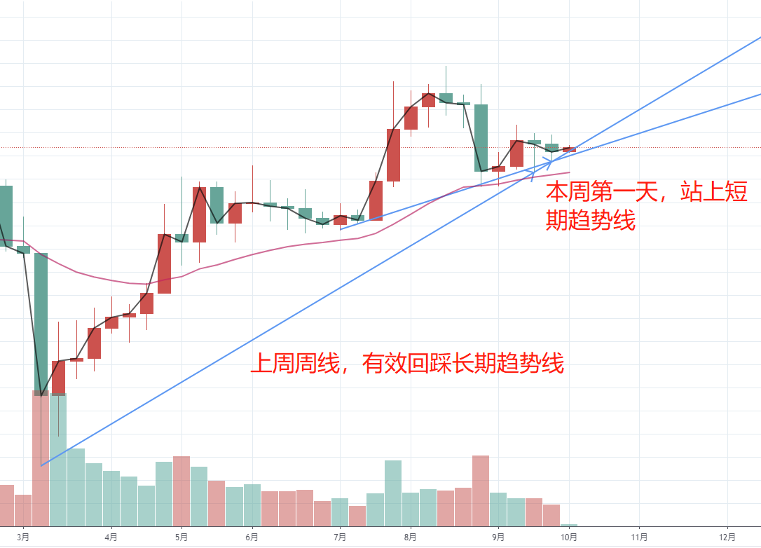 前两天我在文中有指出,周线回踩趋势线反弹力度不错,只要10月5日起的周线不发生有效跌破趋势线的走势(周线收盘价位于趋势线下方,即有效跌破),后市的长线趋势,可谓大利好。