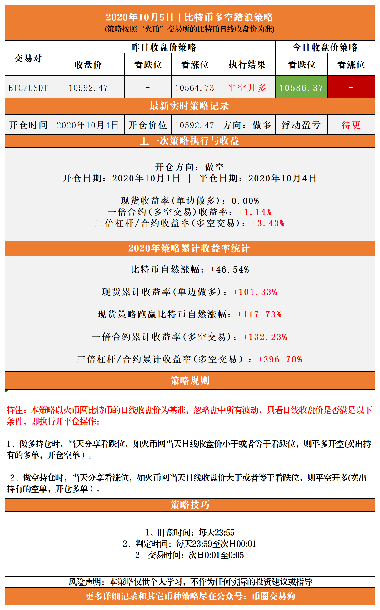 昨天,踏浪策略完成了本次的开平仓,由空头转为多头,一倍合约(做空)收益率拿到了+1.14%,10月1日平多开空,10月4日平空开多,今年踏浪策略的累计收益率,现货达到了101.33%,一倍合约(多空双向交易)达到了132.23%,再次证明了本套策略的有效性。