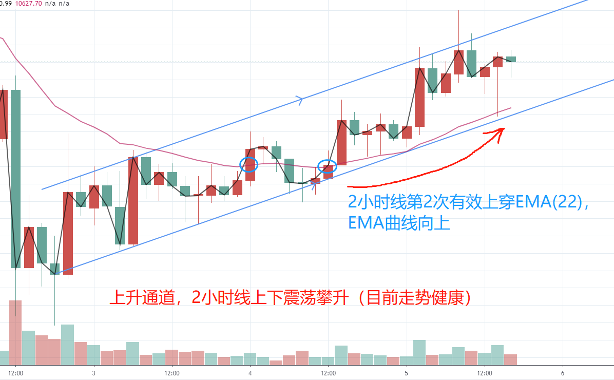 图中,沿着K线的边缘画出了一条倾斜角度不错的上升通道,从K线的走势 来看,2小时线完美的运行在这条通道里,一会儿触及上端,一会儿回踩下端,再加上第2次上穿EMA(22)这条神奇的策略级曲线,走势非常健康。