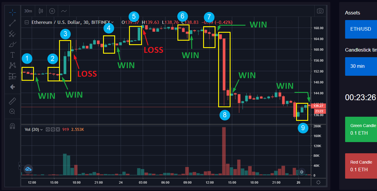 Today's strategy could not be simpler yet it is very effective. All you have to do is wait for three candlesticks of the same color to form in a row and then place a bet that the fourth candle will be of opposite color. That’s it! You can backtest the validity of this strategy by studying ETH/USD price chart yourself and I also added a recent image of a chart to show you how great this strategy actually works.