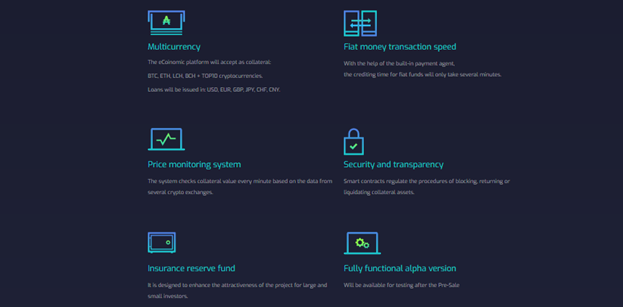 This year, eCoinomic plans to launch a financial services platform based on cryptographic assets. The prototype of the loan service is in the final stages of development and the project requires ICO funding to launch the Alpha version. In the long term, the eCoinomic platform aims to offer users a range of services including exchange, transfer, financial management, virtual card issuance and more, but the main focus of the first phase of the platform is guarantees fiat loans.