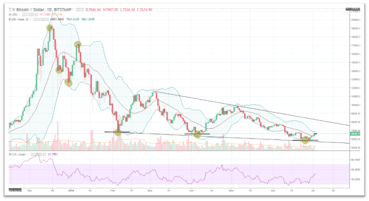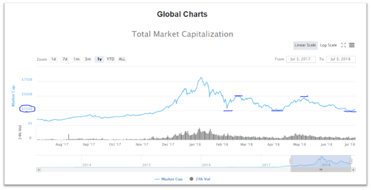 The year of 2018 has been a wild ride for the Cryptocurrency markets consisting of mostly bearish activity across the various coins and tokens being traded. February and April had some nice movements but most recently, May and June have been very bearish, with the overall market capitalisation trending downwards continuously. The question on everyone’s minds and particularly for those who are holding through the bear market rather than trading is, ‘where is the bottom’? Well, there are several ways to look at it and several factors to consider.