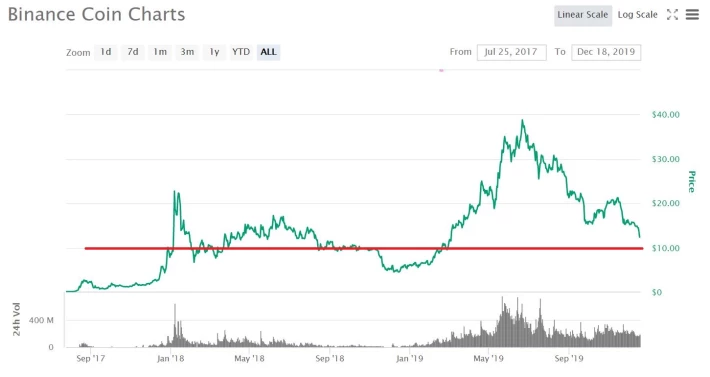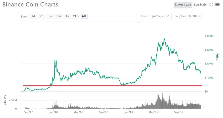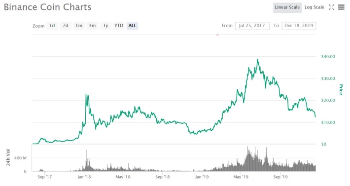 The chart above shows Binance Coin’s price history starting from July 25, 2017, to December 18, 2019, on a linear scale.
