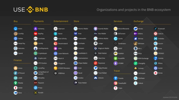 BNB can also be used as a payment method for products and services outside of the Binance ecosystem. BNB is currently supported as a payment method at more than 30 different companies and is also partnered with 14 different crypto payment processors so that it can be used in-store and online.