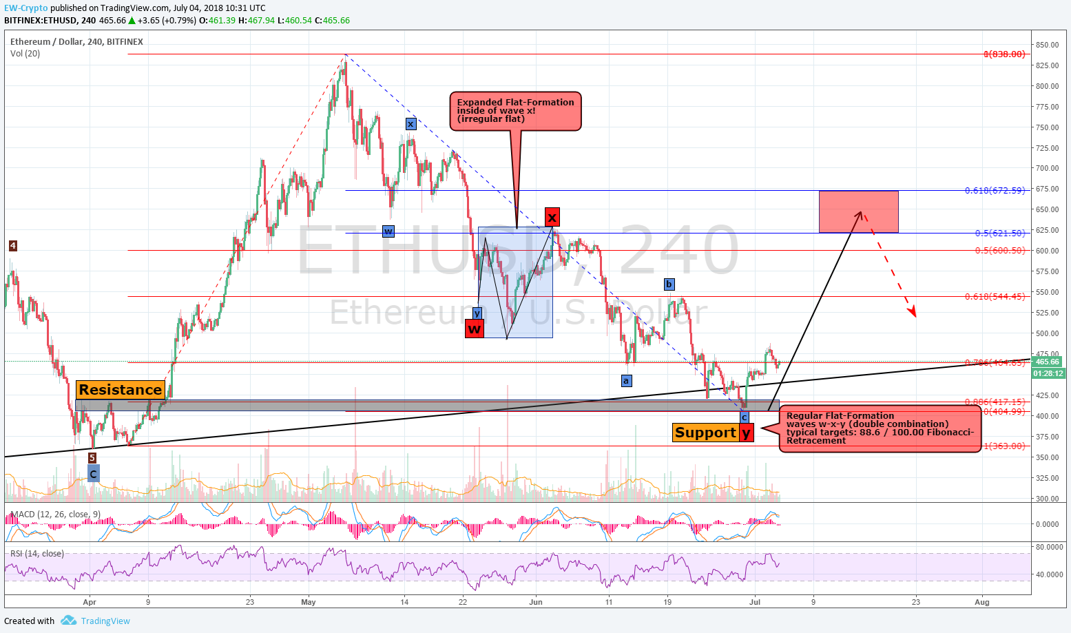 ETH / USD could have recently found a bottom with the low at 405.00 $. The correction was very clean in a visible double Zig-Zag. According to Elliott Wave, this is a combination of two composite correction patterns. These two double Zig-Zag formations in the structure of a W-X-Y formation.
