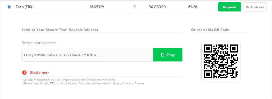 Minimum deposit of 20 TRX. Deposit below that cannot be recovered.