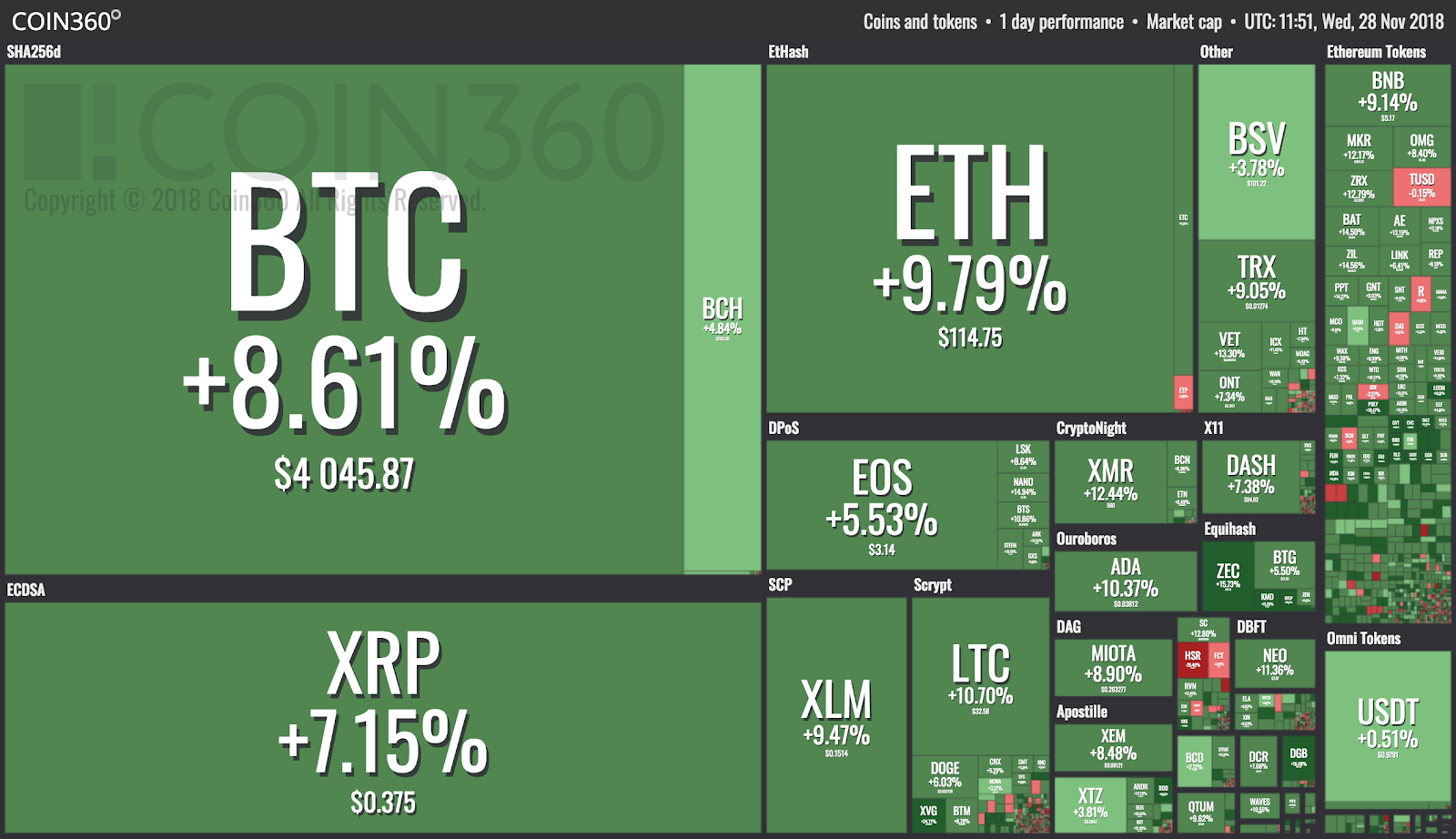 Wednesday, Nov. 28: After the dramatic Nov. 14 market dump, cryptocurrencies are staking major recoveries across the board, with all of the major coins seeing significant growth and scattered assets sealing double-digit gains, as data from Coin360 shows.