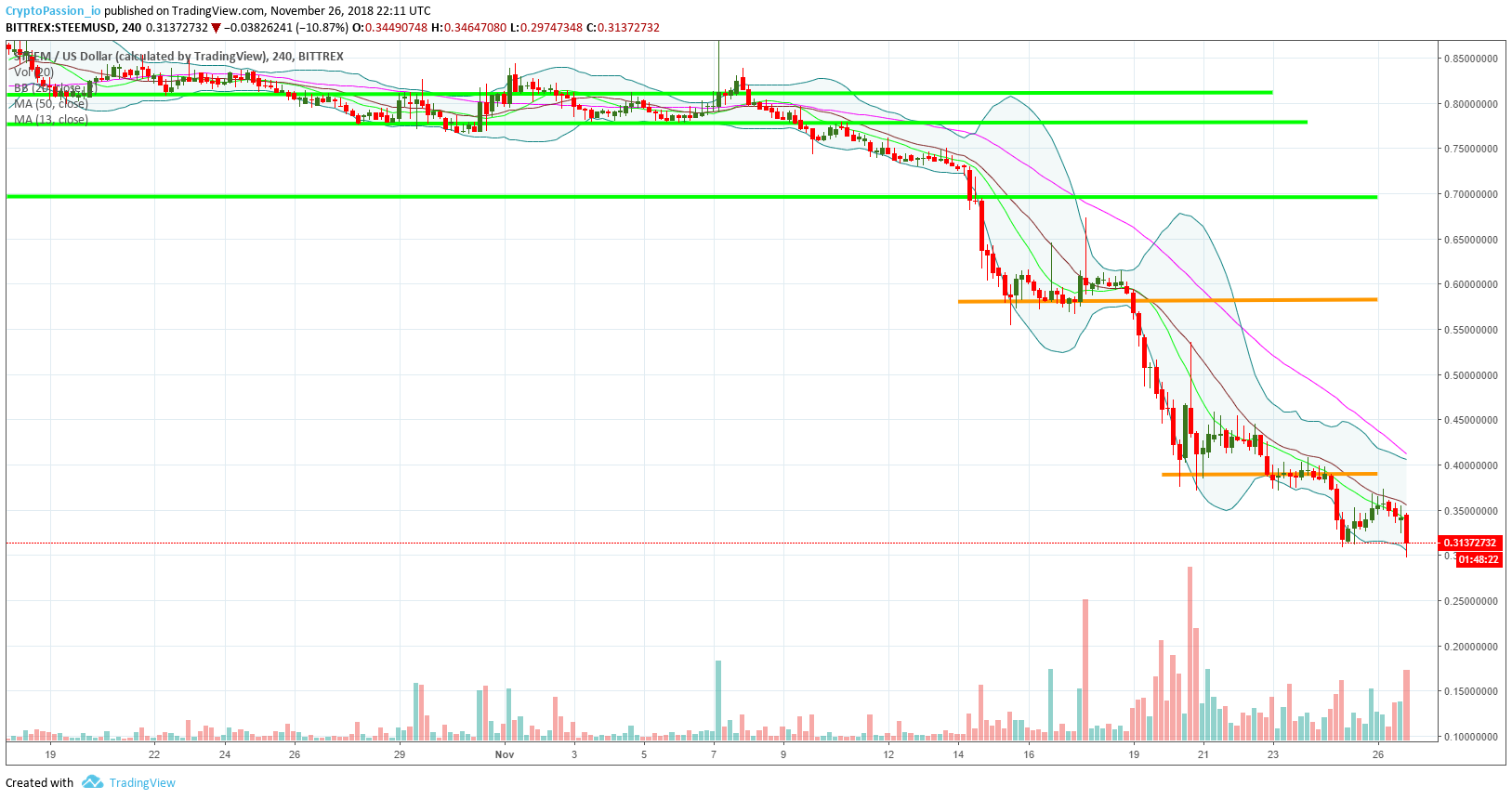 The STEEM is still doing lower lows and lower highs. We broke the previous low, slightly but we broke it and we have now to see if the next high will be lower than the previous high also. The ideal scenario would be that we go test the orange line that I traced to you. It would be a nice indicator that the short term low is done. Let's see what we will do this monday.