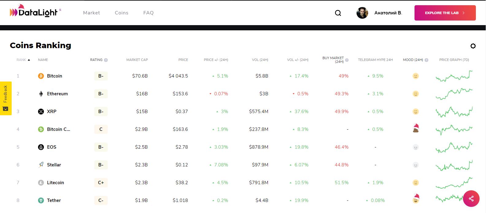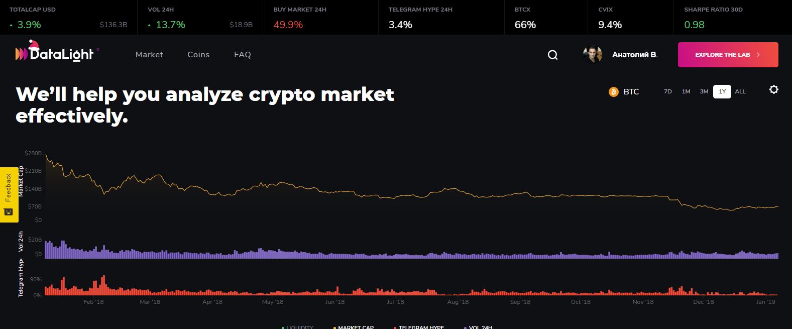 DataLight Lab was designed to present useful and insightful data in a convenient and customizable form. You can select necessary metrics and coins, set up graphs and diagrams any way you like, analyze interrelation of different data (and its influence on the price) and create a super convenient dashboard.