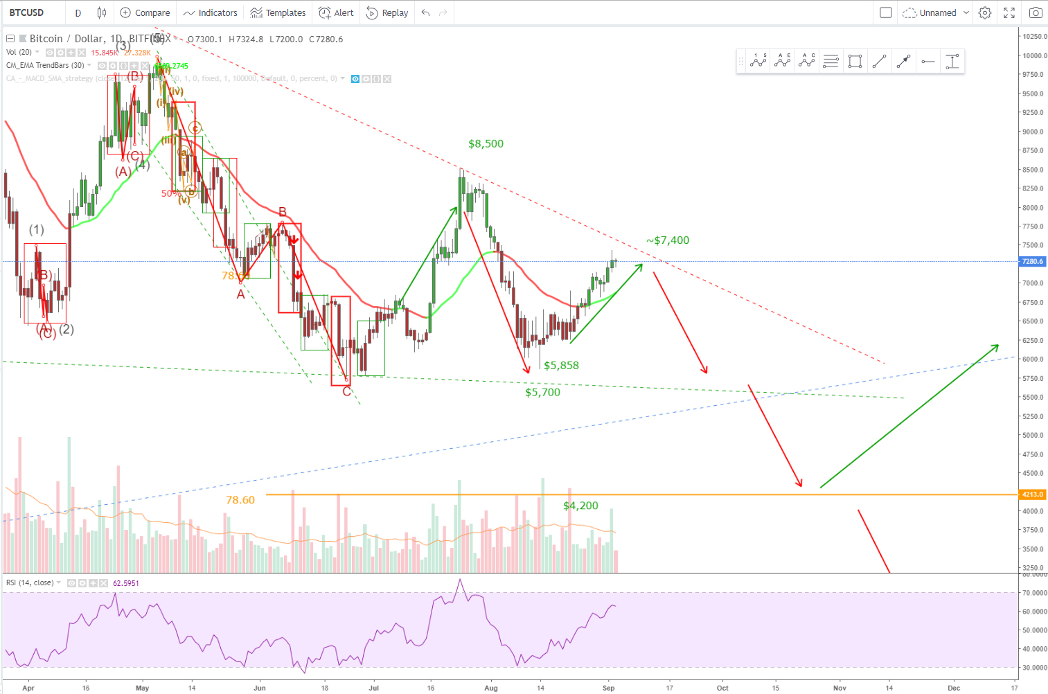 I'm anticipating BTC to go lower for another check of $6,000 $5,858 $5,755 and finally $5,500-5,600 lvl. which is lower support line of that Triangle Formation.