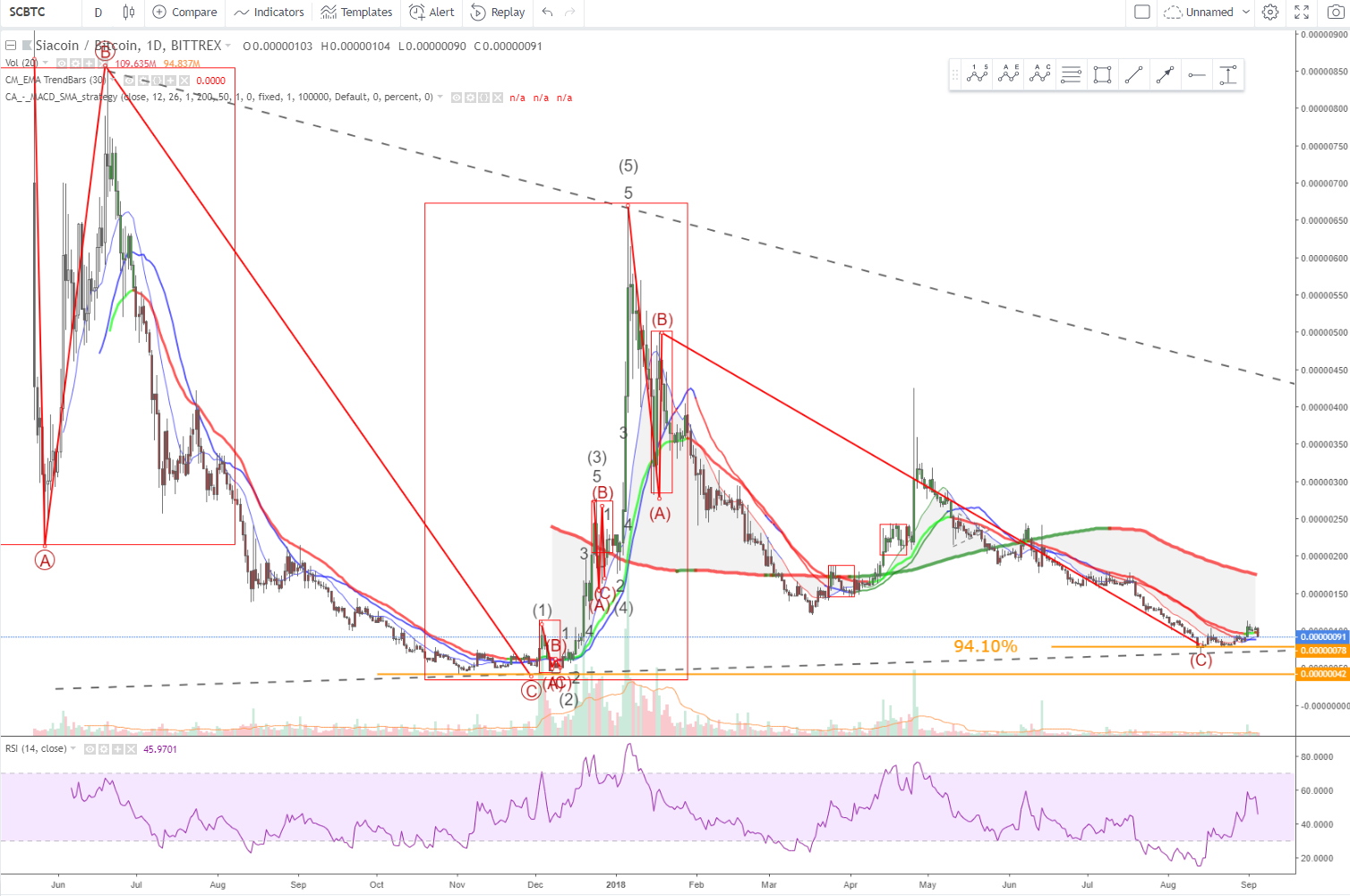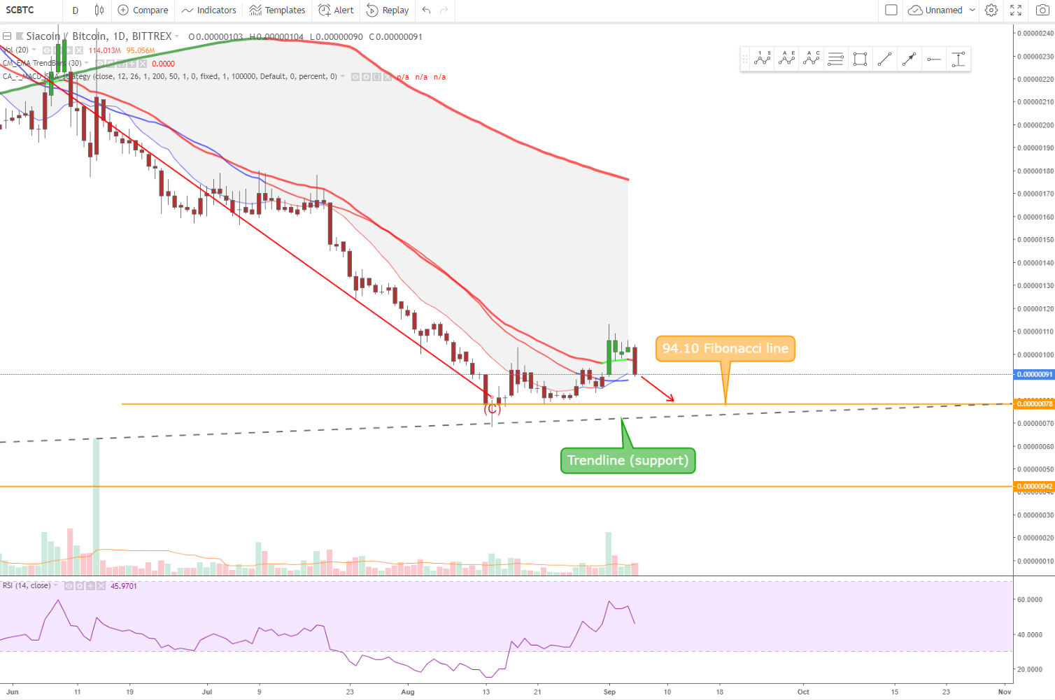SiaCoin reached over 94.10% correction (68 satoshi), which is a very deep one. After that it reached a high of 113 satoshi.
