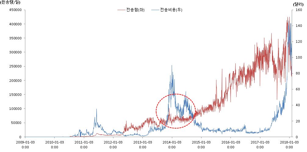 참고 : 비트코인의 전송량과 전송비용추이